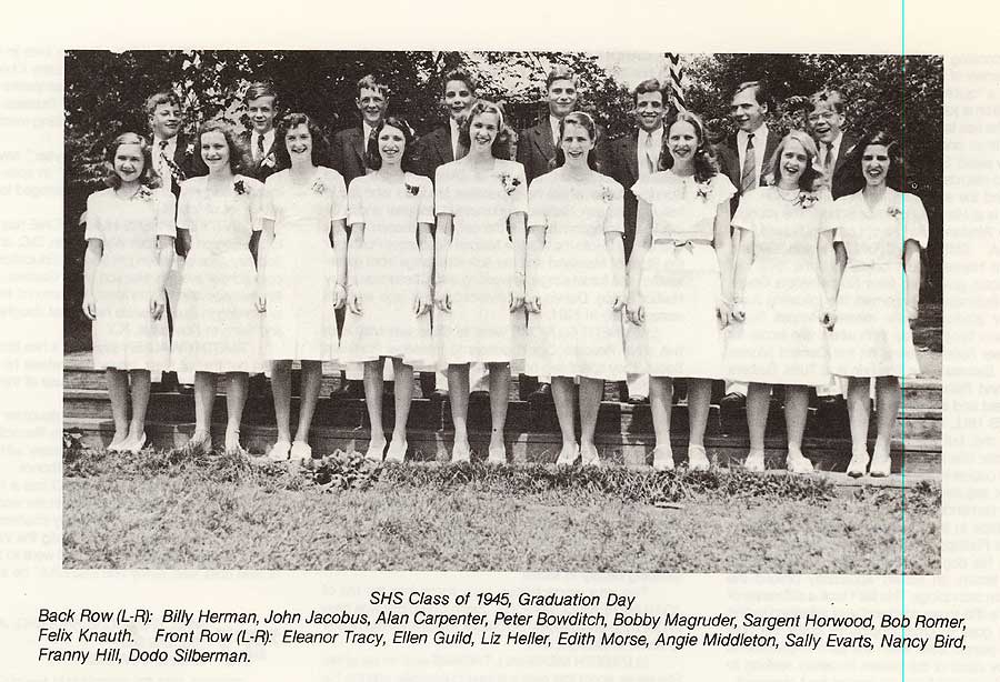 I don't list it on my c.v., but the best school or college I ever went to was Shady Hill School in Cambridge, Mass. (where I grew up). SHS was a K-9 school (now unfortunately only K-8). I wish that I had started in K, but in fact I was only at SHS for 7-9, an excellent three-year stretch, though. There were good friends among my classmates, and truly wonderful teachers. I never "do reunions" (have never attended a single one at my undergraduate college), but I make an exception for Shady Hill. In 1995, I attended my 50th reunion there, and in 2005 my sixtieth. I post the following picture because the supposed 1945 graduation photo of our class, the one that the school currently has posted on the wall at the school, is not correct. I wish I could find a print of the correct photo. The one below isn't from a print but from a low-resolution photo that was printed in the SHS alumni news in 1981. Maybe I can get a better one. I know of at least one person missing: Alan Wood, who came to Cambridge in the fall of 1942 as a refugee child from England. Perhaps by the time of our graduation in May or June, 1945, he was already on his way home.
